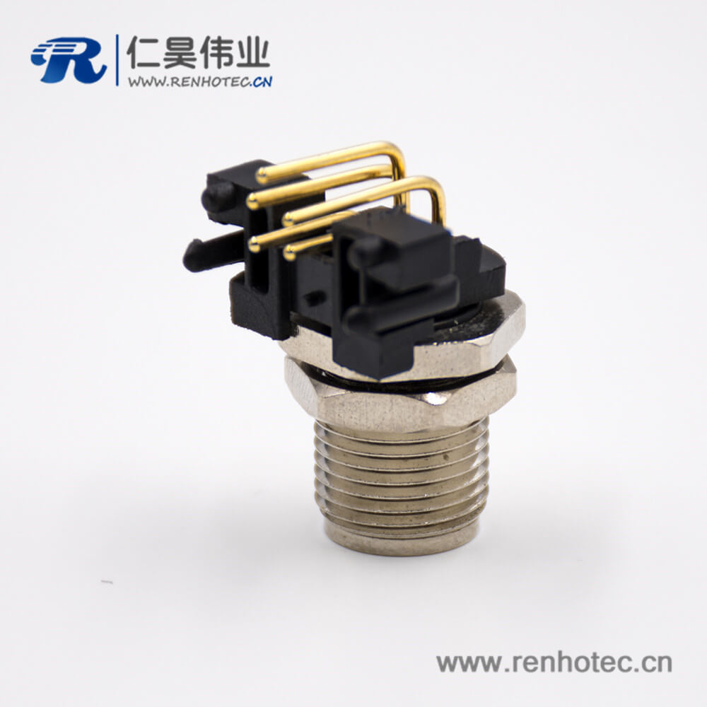 料号:M12-05-A-P-1-R-F 标签:M12板端插座,A扣,弯式,5芯,公头,PCB板安装